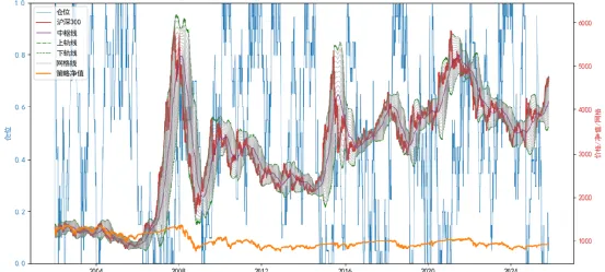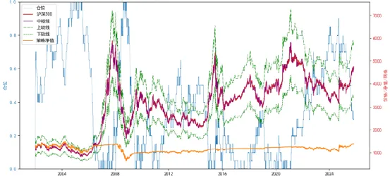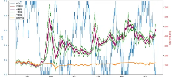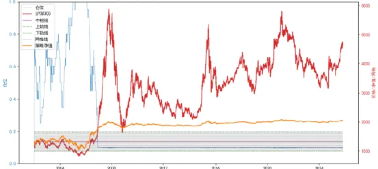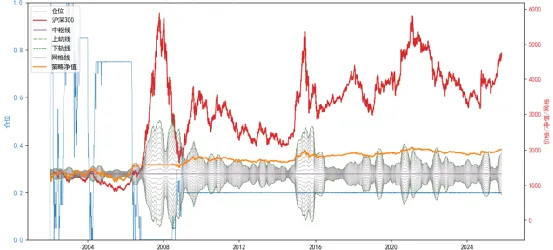 首先被排除的是静态中枢的网格方法,趋势行情里长期空仓,错过所有主涨段。可以看到在红色股指线整体的上升趋势中,紫色的静态网格中枢和绿色的网格边缘线终究有一天会完全落在红色股指线的下方,股指再怎么震荡调整,也跌不到网格处,网格再也给不出买入信号。蓝色的仓位信号线会在某一刻后长期保持在空仓或极低仓位。这说明静态中枢或许在某几年有用,但做不到永远有用。